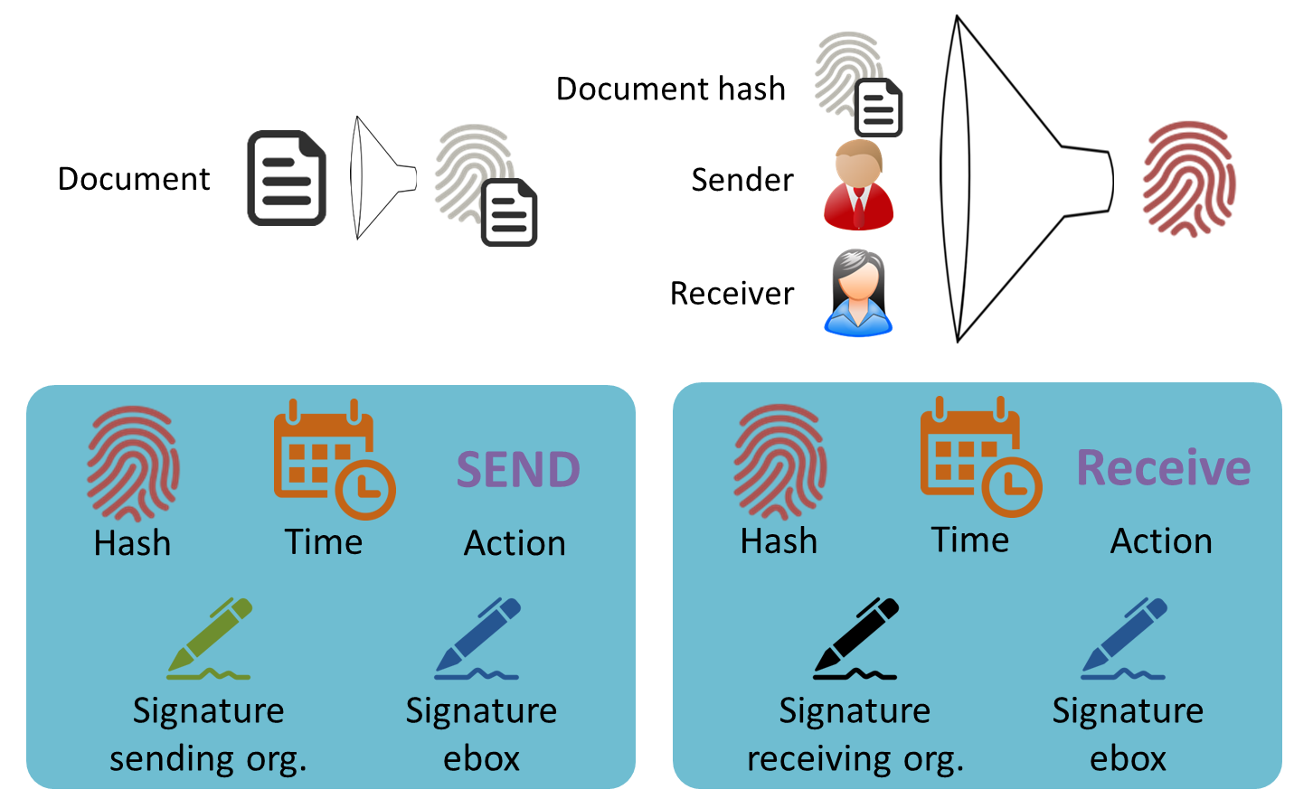 Per document worden twee bewijzen gecreëerd: eentje dat bewijst dat een specifiek document afkomstig van Alice en bestemd voor Bob op een bepaald moment verstuurd werd naar de eBox, en eentje dat bewijst dat het document ook op een bepaald moment ontvangen is. Zo’n bewijs is eigenlijk een akkoord tussen de betrokken organisatie en de eBox. Het is een blockchain-transactie die door de twee partijen ondertekend wordt. De creatie van dit akkoord is een proces tussen slechts de twee betrokken partijen.