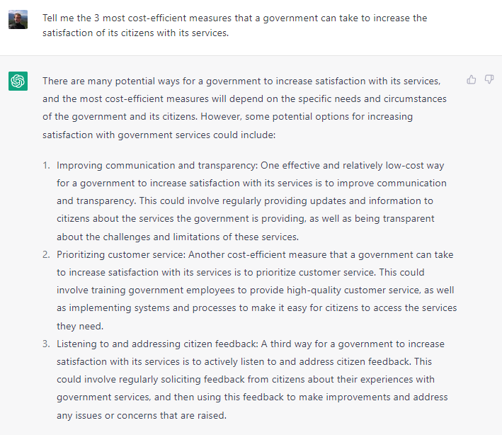 ChatGPT is als generatieve AI zeker ‘goed genoeg’ voor heel wat toepassingen waar men creatief met tekst omgaat, en waar feitelijke correctheid van de inhoud minder van belang is. Dat gebrek aan garanties op correctheid van de inhoud is dan ook meteen de grootste rem op de adoptie van deze technologie in de publieke sector.