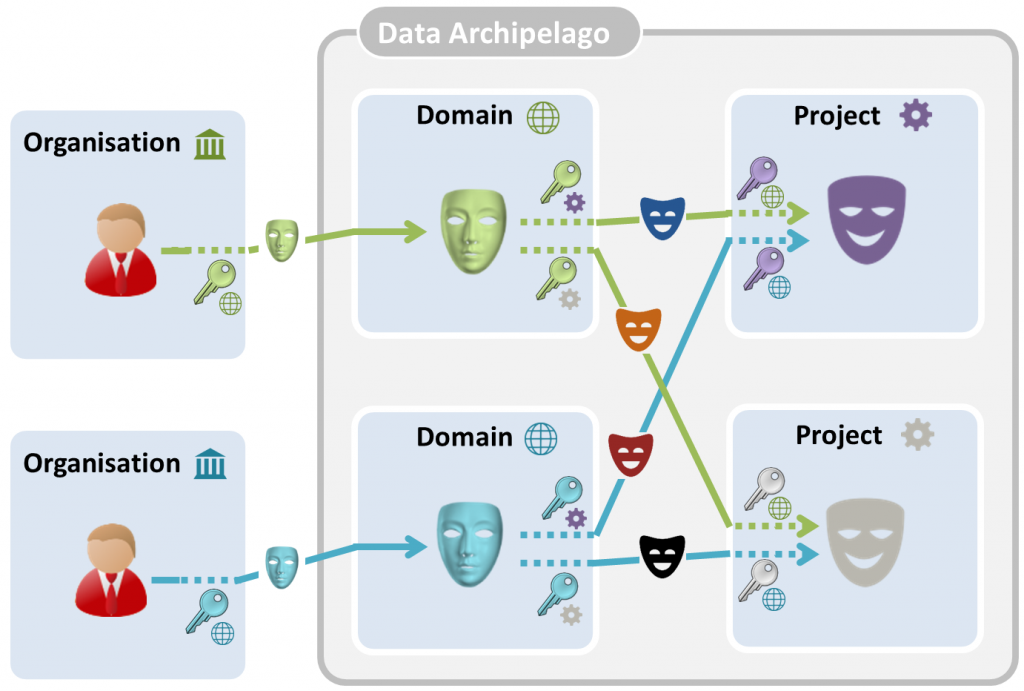 Each organization has a master key, each domain island has a key per project that it delivers data to, and each project island has one key per domain that it receives data from.