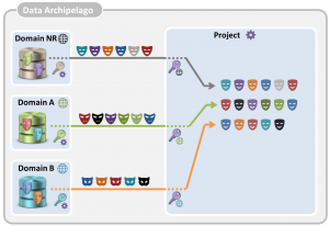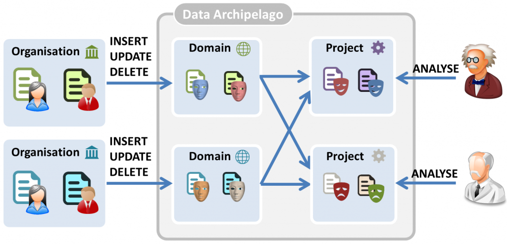 Domain islands. Each data-providing organization controls its own domain island (or islands) and keeps the contained data up-to-date. It only uploads these personal data to the domain islands that might be made available for data analysis projects. The data in the domain island is, hence, a subset of all the personal data controlled by the government organization. We use two principles to maintain perfect isolation between domain islands:
