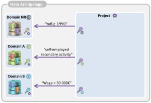 Let’s have a look at the example described in the introduction. A research team wants to analyse large sets of personal data. Say it needs medical, financial and demographic data of all citizens with a wage of at least EURO 40.000, born after 1990 and who are self-employed as a secondary activity. For the moment, we restrict our example to three domain islands and assume that the required personal data are stored in the second and third domain island: