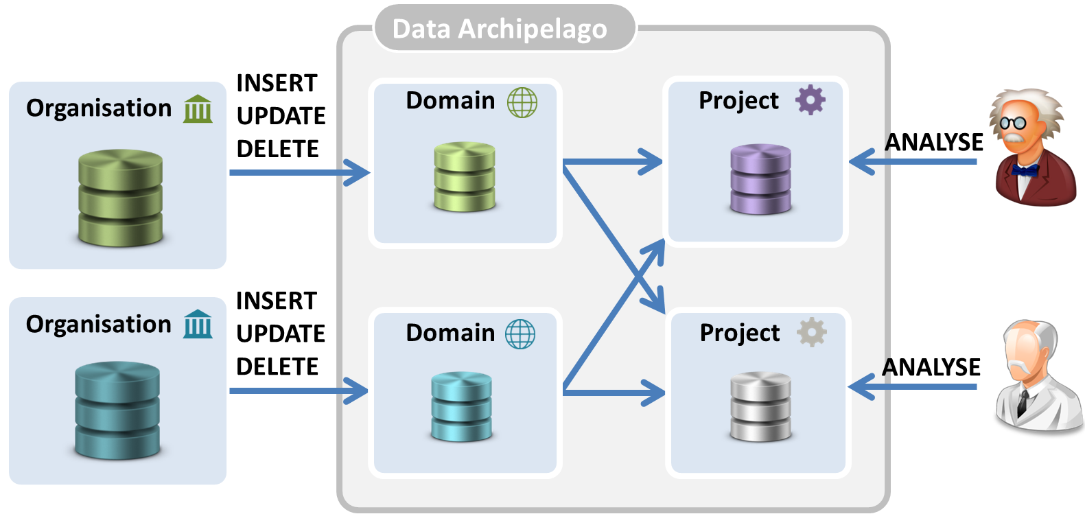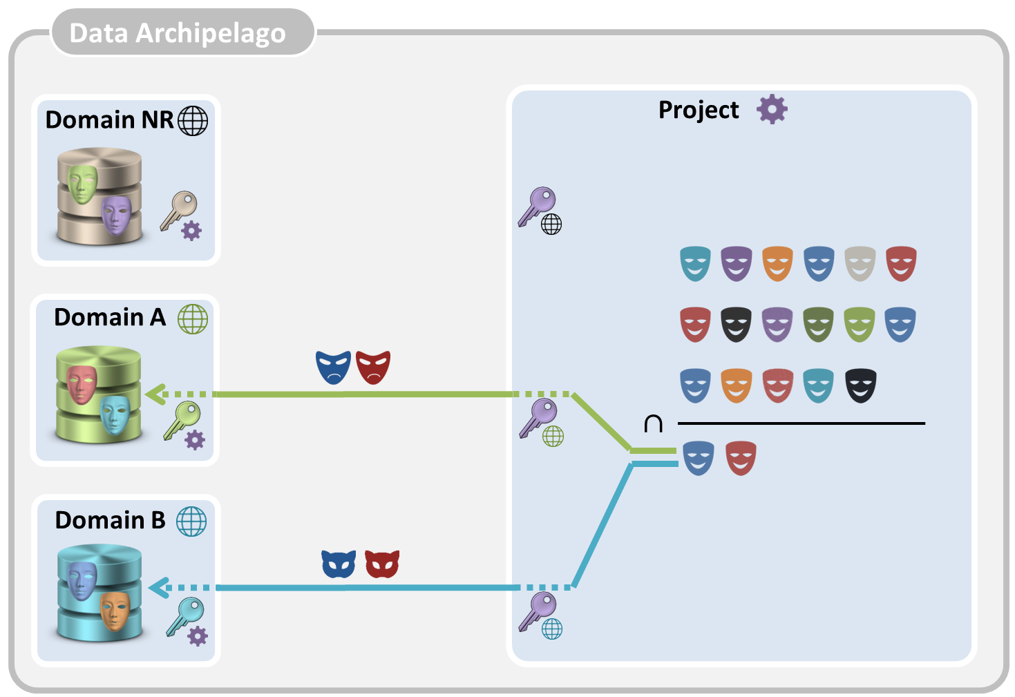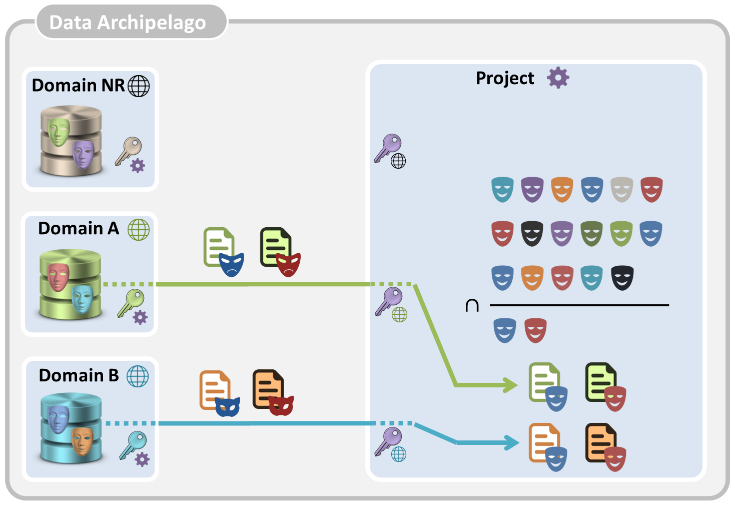 Domain islands. Each data-providing organization controls its own domain island (or islands) and keeps the contained data up-to-date. It only uploads these personal data to the domain islands that might be made available for data analysis projects. The data in the domain island is, hence, a subset of all the personal data controlled by the government organization. We use two principles to maintain perfect isolation between domain islands: