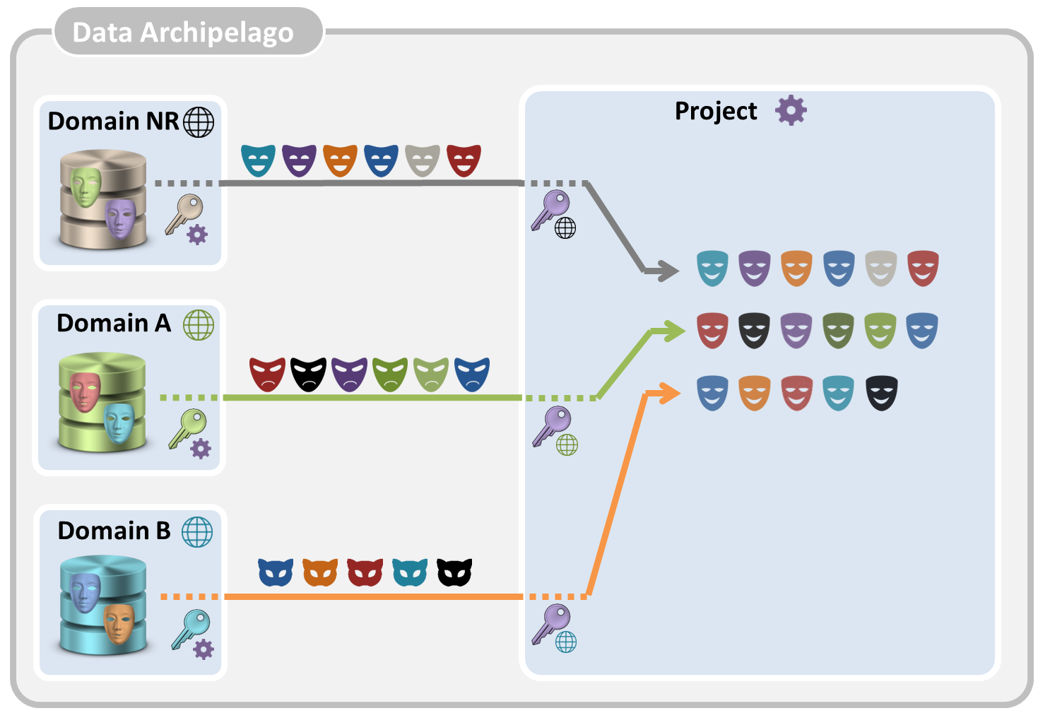 When a project is created, the involved domain islands each obtain a project-specific key, and the project island obtains a domain-specific key per involved domain island. Domain pseudonyms are converted with the project-specific key into unique transfer pseudonyms. When these transfer pseudonyms are received by the project island, they are converted with the domain-specific key into a project pseudonym. The transfer pseudonyms are deleted after the data transfer. Once all data is delivered by the domain islands to the project island, the associated keys in the project and the islands should be removed. The government organizations should, however, maintain their master keys.