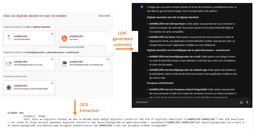 Vergelijking van verschillende methoden om tekst uit een afbeelding te extraheren: rechts wordt een samenvatting van de afbeelding gegenereerd met behulp van een groot multimodaal model, en hieronder wordt de tekst geëxtraheerd met behulp van OCR.