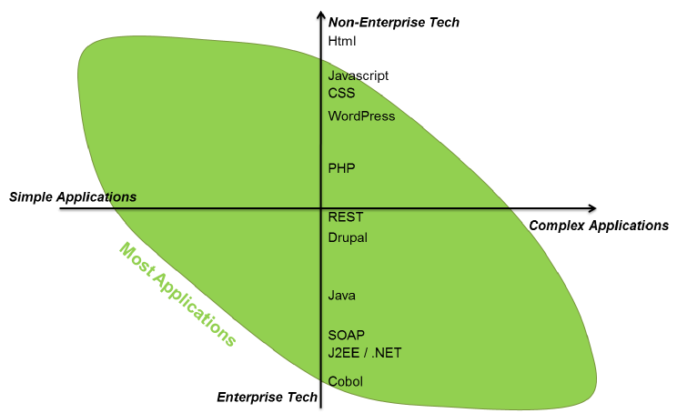 De groene “Blob” tenslotte, is waar, volgens mij, het grootste gewicht van alle web development gebeurt: traditioneel en logischerwijs worden dus de meeste eenvoudige sites en applicaties met eerder eenvoudige technologieën gebouwd. Zware en complexe applicaties worden echter – vaak terecht – met enterprise-ready technologieën gebouwd. Business as Usual…