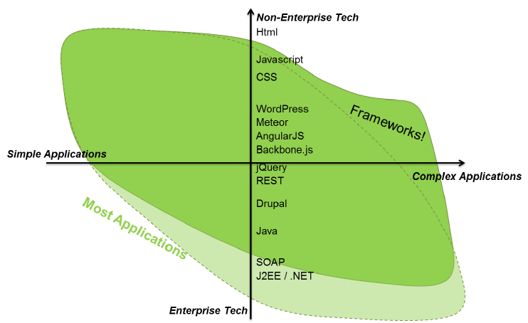 Zoals in het begin reeds gezegd: meer en meer web development schuift weg van technologie die te “Enterprise” is, richting lichtere raamwerken die alles in het werk stellen om het bouwen van webapplicaties zo snel en eenvoudig mogelijk te maken. In de onderstaande figuur vertaalt zich dit in een verschuiven van de onderkant van de “blob” naar boven toe: dus ook voor complexere applicaties worden nu meer en meer lichtere en kleinere bouwstenen gebruikt.