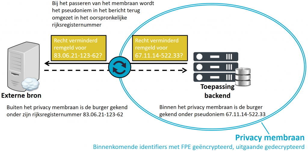 Het privacy membraan is een gezamenlijk concept – er is nog geen code – van de dienst informatieveiligheid en de dienst onderzoek van Smals. Het idee is dat een omgeving, bijvoorbeeld een toepassing in acceptatie, omgeven wordt door een virtuele schil, het privacy membraan. Alle rijksregisternummers die het privacy membraan binnenkomen worden omgezet in een structuurbehoudend pseudoniem. Alle structuurbehoudende pseudoniemen die het membraan verlaten worden bij het passeren van het membraan opnieuw omgezet in het oorspronkelijke rijksregisternummer. Binnen het membraan is dus enkel het pseudoniem gekend. Een dergelijke aanpak is transparant voor zowel de toepassing(en) binnen het membraan, als de toepassingen/services waarmee gecommuniceerd wordt.