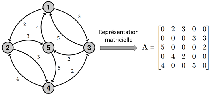 Dans l’exemple illustratif, il y a un arc de poids 3 allant du nœud 1 au nœud 3, et un arc de poids 5 allant dans le sens inverse. La matrice A contient donc la valeur 3 en position (1,3) et la valeur 5 en position (3,1).
