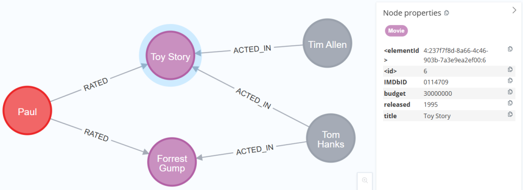 De drie componenten van een graph database zijn nodes, bogen en properties. Deze eigenschappen kunnen ofwel op de nodes, ofwel op de bogen, ofwel op beide worden geplaatst. Laten we eens kijken naar het voorbeeld in Figuur 1, de node “Paul” kan bijvoorbeeld gelinkt worden met eigenschappen zoals zijn geboortedatum en adres, voor de nodes die films voorstellen kunnen we eigenschappen associëren zoals het jaar van uitgave, het budget en de IMDb identifier, en op de “RATED” relaties tussen een gebruiker en een film kunnen we eigenschappen associëren zoals de kijkdatum en de waardering (op 5) die de gebruiker aan de film geeft.