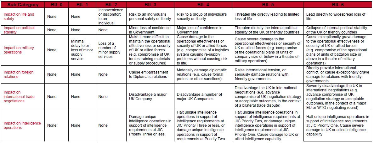 Als basis is er het classificatiesysteem dat ook in de G-Cloud gebruikt wordt. Het bestaat uit 7 categorieën of Business Impact Levels, afgekort BIL of IL, lopend van IL0 (No impact) tot IL6 (Top secret).