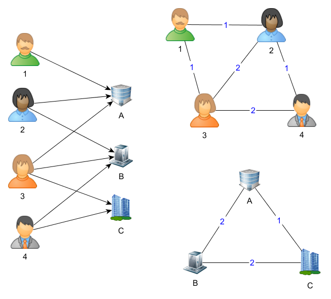 Lorsque l’on a un graphe biparti, c’est-à-dire un graphe avec deux types de nœuds A et B (comme par exemple travailleur et employeur) et des arcs qui vont uniquement entre un nœud du type A et un nœud du type B (comme par exemple les relations de travail), on peut réaliser ce qu’on appelle une projection biparti. Il s’agit d’un graphe qui ne comportera que des nœuds d’un type A (resp. B), et qui aura un arc entre deux nœuds x1 et x2 s’il existe dans le graphe d’origine un nœud du type B (resp. A), lié à x1 et à x2. Il existe toujours deux projections d’un graphe biparti : une pour chaque type de nœud. Dans le cas qui nous occupe, nous aurons un graphe reprenant la totalité des employeurs, et un lien entre deux employeurs s’il existe une personne ayant travaillé pour les deux employeurs, et un graphe reprenant la totalité des travailleurs, avec un lien entre deux travailleurs s’ils ont un jour été collègue (en supposant deux personnes collègues si elles ont travaillé pour un même employeur, mais pas nécessairement en même temps).