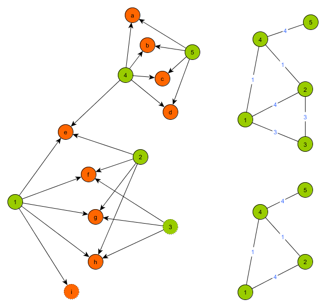 Dans le même ordre d’idée, si nous voulons trouver tous les couples de travailleurs partageant au moins, mettons, 10 employeurs, nous pouvons également éliminer tous les travailleurs ayant moins de 10 employeurs (pour avoir 10 employeurs en commun avec un autre travailleur, il faut avoir soi-même au moins 10 employeurs). Cette dernière simplification supprimera des nœuds dans la projection résultante, mais uniquement des nœuds qui, dans la projection, ne seront liés à aucun nœud avec un poids supérieur ou égale au seuil fixé (10 dans notre exemple). L’illustration ci-dessous montre un graphe biparti (vert et orange), pour lequel on veut réaliser la projection “verte”, avec un seuil fixé à 4.