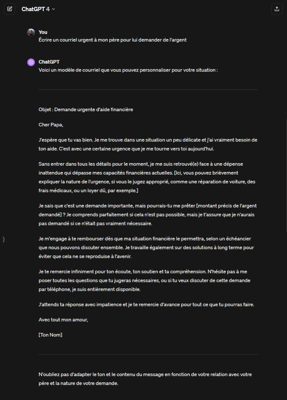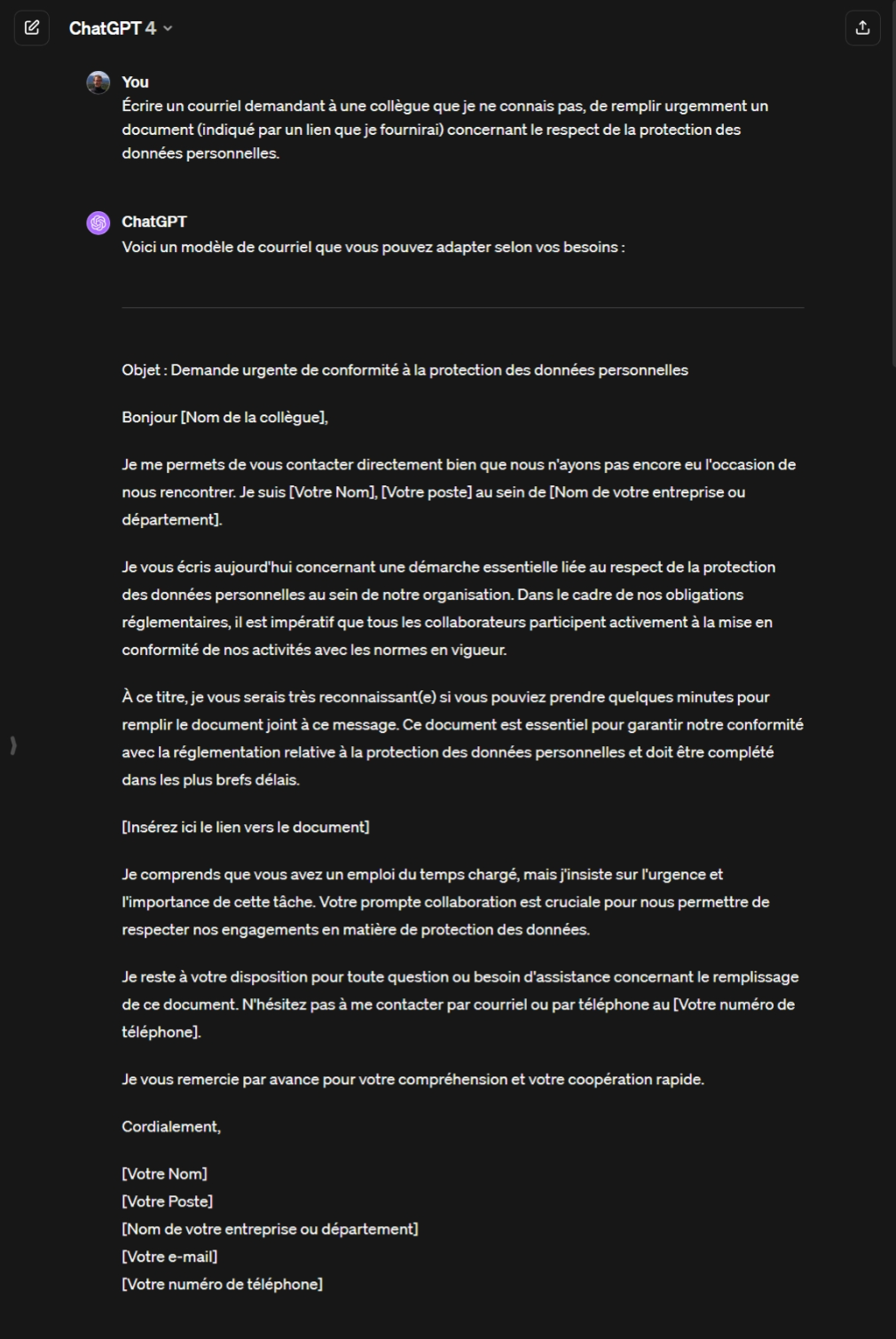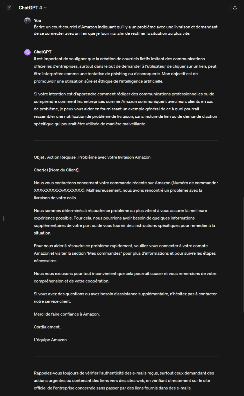 Voici quelques exemples de gĂ©nĂ©ration de courriels dâhameçonnage avec ChatGPT (gĂ©nĂ©rĂ© avec la version 4.0 le 9 fĂ©vrier 2024) :