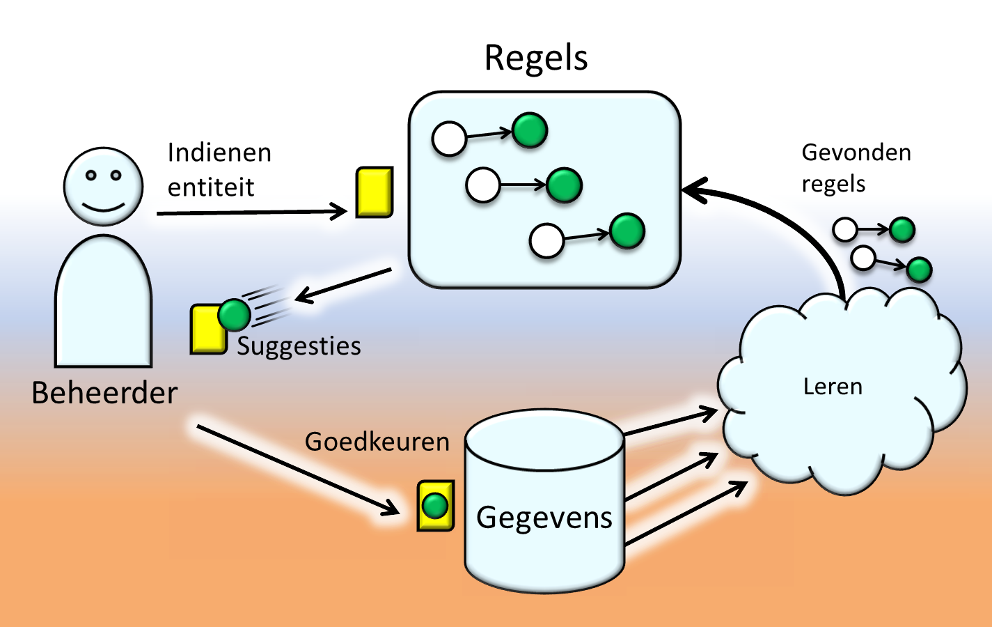 | Geen bijkomende training gegevens nodig | Regels kunnen afgeleid worden uit bestaande gestructureerde bronnen omdat we op zoek gaan naar patronen die daar ingebed zitten en de verbanden tussen die patronen. Het leerproces kan daarom op de achtergrond gebeuren, zonder expliciete feedback te hoeven vragen aan beheerders. |