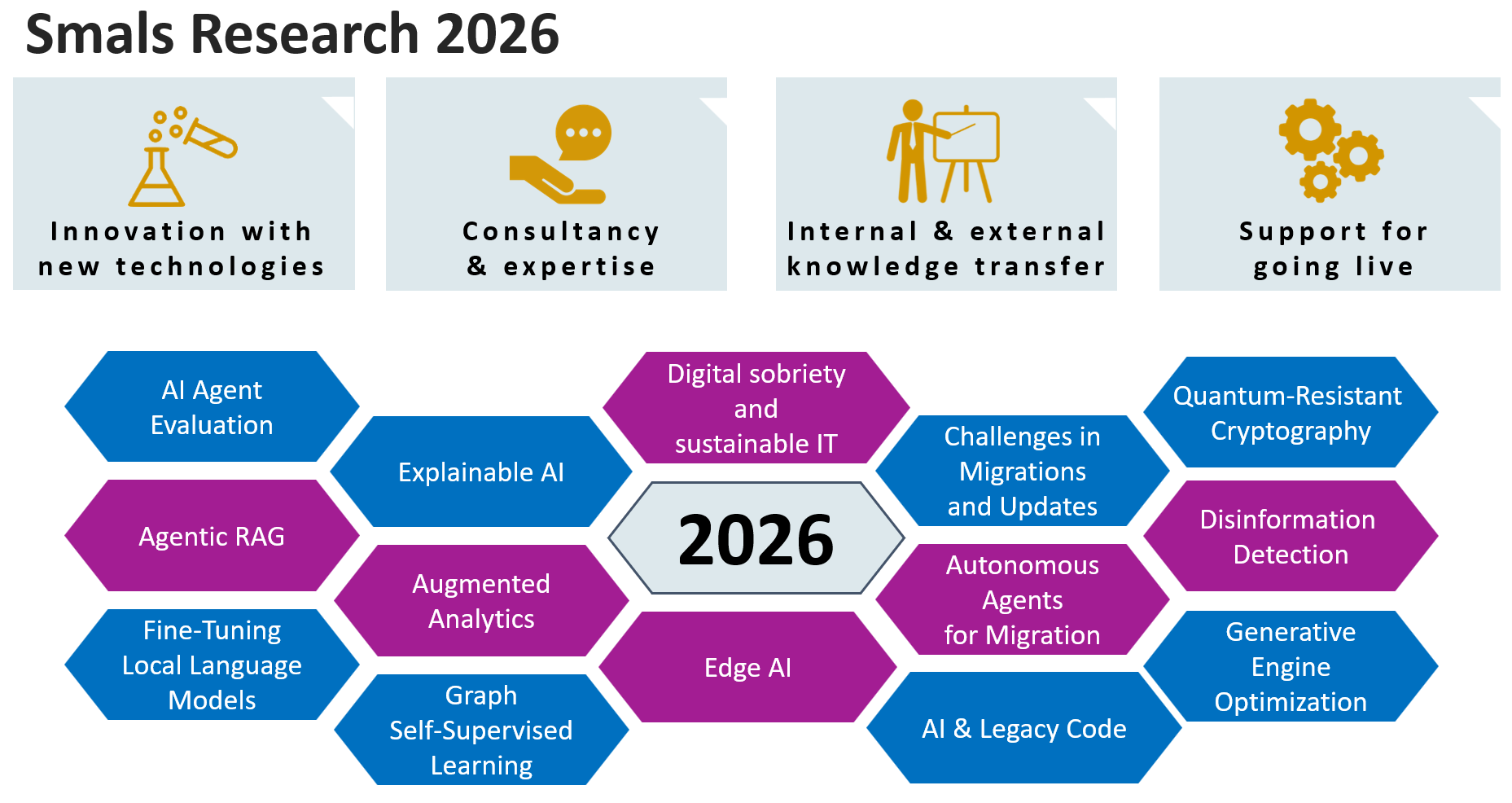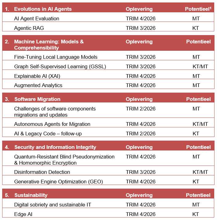 Het Plan Onderzoek 2026 werd voorgelegd op het Bestuursorgaan van Smals van 10 december 2025. De 14 onderzoeksprojecten werden opgedeeld in 5 luiken: Evolutions in AI Agents, Machine Learning: Models & Comprehensibility, Software Migration, Security and Information Integrity, Sustainability. De research radar 2026 diende hierbij als uitgangspunt.