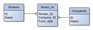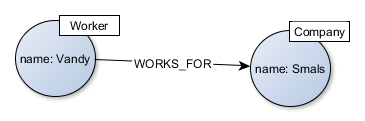 Reprenons l’exemple de notre blog précédent, illustré ci-contre, où l’on modélisait la relation entre des travailleurs et leurs employeurs. Une implémentation dans un modèle RDBMS requiert deux tables représentant les entités (“Workers” et “Companies”), une table représentant la relation (“Works_for”), et la gestion fastidieuse d’une série de clés primaires et étrangères à utiliser dans chaque requête.