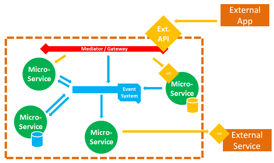 De microservices daarentegen moeten snel kunnen evolueren en aangepast kunnen worden. Soms worden ze zelfs volledig vervangen (ze zijn disposable: het verlies blijft beperkt doordat ze kleiner zijn). Sowieso zal één microservice ook nooit een volledige API implementeren (tenzij als het echt om een miniscuul klein product zou gaan): achter de API bevindt zich doorgaans een hele batterij van componenten, waarbij verschillende microservices de effectieve business logica zullen uitvoeren. Andere componenten zijn bijvoorbeeld een Event bus, maar ook en vooral een API bemiddelingstool (“mediation”), die ervoor zal zorgen dat de calls naar de API bij de correcte afhandeling terecht komen, en op die manier de microservice loskoppelen van de ondersteunde API. Deze tools zijn doorgaans vervat binnen de context van een API Gateway of API Management suite.