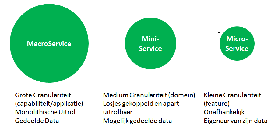 We zullen het daarbij hebben over een aantal categorieën of grootteordes van services: microservices, miniservices en macroservices. En dan zetten we er ook nog zogenaamde nanoservices langs, die eigenlijk (nog?) geen officiële definitie hebben… Al deze architecturele paradigma’s zijn in zekere mate geïnspireerd door de reeds langs gekende Service-Oriented Architecture (SOA).