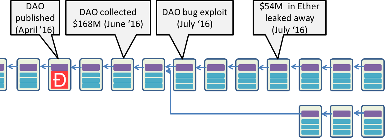 Dit hebben we kunnen vaststellen met The DAO; een crowdfunding contract dat op 30 april 2016 gepubliceerd werd op het publieke Ethereum netwerk. Op 21 mei had het reeds meer dan 150 miljoen dollar verzameld, afkomstig van meer dan 11000 investeerders. Het werd daarmee de grootste crowdfunding campagne ooit. En hoewel het contract door experts nagekeken was, bevatte het een bug. Op 17 juni 2016 werd het gehackt, waardoor op twee dagen tijd ongeveer één derde van het totale bedrag in handen kwam van de hacker (of hackersgroep). Dit leidde tot twee kampen in de Ethereum community en tot een split van de publieke Ethereum blockchain. Het grootste deel van de community besliste om het meest recente deel van de blockchain tot voor de hack te vergeten door verder te bouwen op een ouder blok i.p.v. het meest recente. Op die manier werd een nieuw heden gecreëerd waarin de hack nooit heeft plaatsgevonden, zoals geïllustreerd in onderstaande figuur. Een deel van de community bleef echter voortbouwen op de oude tak van de blockchain. In de ene tak heeft de hack wel plaatsgevonden, in de andere niet.