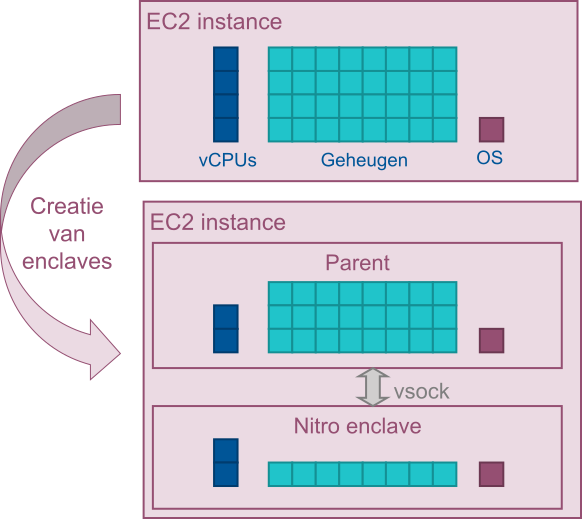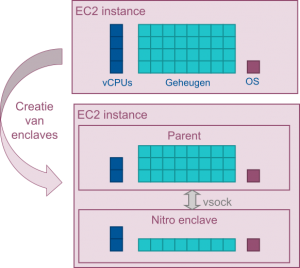 Nitro enclaves daarentegen zijn geïsoleerde virtuele machines die draaien op een klassieke EC2-instantie, een zogenaamde ‘parent instance’ (Figuur 3).