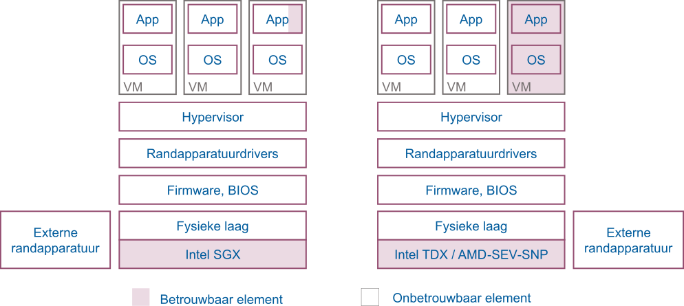 AMD en Intel zijn de twee voornaamste fabrikanten van microprocessors die noodzakelijke functionaliteiten bieden voor de confidential computing in grote data centers2. Terwijl Intels TDX en AMD’s SEV-SNP-technologieën ontwikkeld zijn om complete virtual machines (VM’s) te beschermen, is de SGX-technologie erg verschillend en heeft deze een kleiner attack surface. Figuur 1 toont de elementen die de Trusted Computing Base (TCB) vormen voor deze drie technologieën die we in de volgende paragrafen beschrijven.