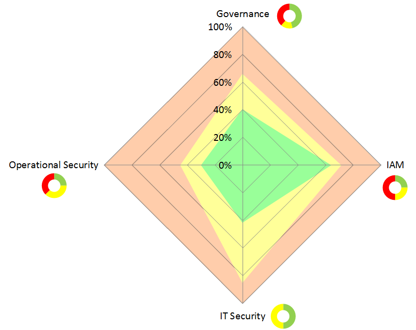 Met de vragenlijst “Security-assessment-cloud-service.xlsm” wordt inzicht verkregen in het maturiteitsniveau van de beveiliging van een specifieke clouddienst, op basis van een reeks meerkeuzevragen. Deze vragen zijn opgedeeld in vier dimensies (of hoofdcriteria), zijnde governance, identiteitsbeheer en toegangscontrole, IT-beveiliging en tot slot operationele beveiliging. Het resultaat wordt overzichtelijk gevisualiseerd in een radardiagram, zoals geïllustreerd in de figuur hiernaast, waarbij elke windrichting overeenkomt met één dimensie.
