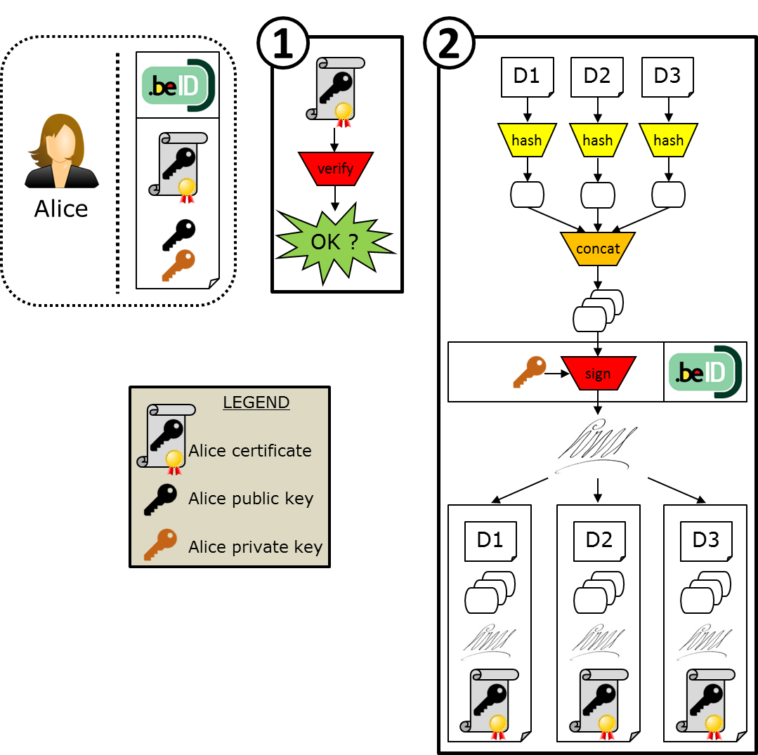Let’s imagine that Alice wants to sign 3 documents D1, D2 and D3. In order to do so, the software first verifies that the certificate chain of trust of Alice’s plugged eID is correct, including, when there is an internet connection, whether the certificates are revoked or not on the official webpage.