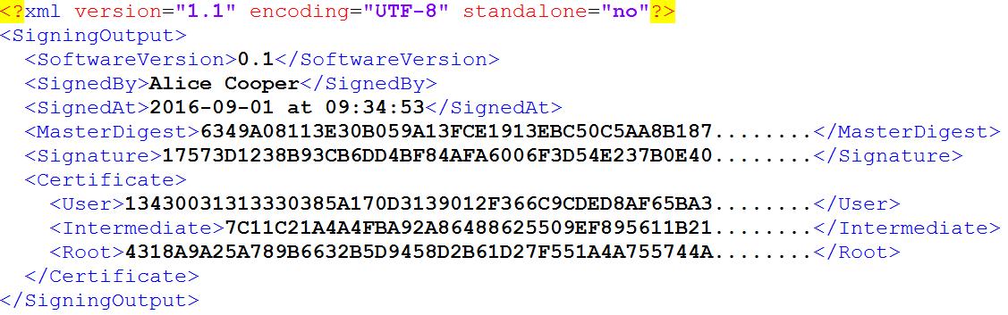 If the hash value is found in the master digest, then SmalsBeSign checks two more things. First, it verifies if the certificate chain of trust of Alice’s eID (contained in the signature file) is correct, including, if there is an internet connection, whether the certificates are revoked or not on the official webpage. Then, it verifies if the signature of the master digest is valid with Alice’s public key (this key is stored in the user certificate field of the signature file).