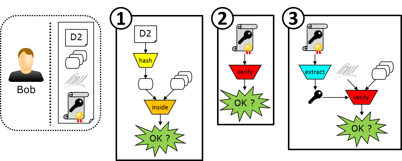 If all these verifications succeed, then Bob is ensured that the signature of the document D2 is correct and performed by Alice.